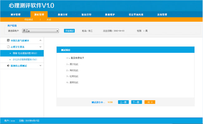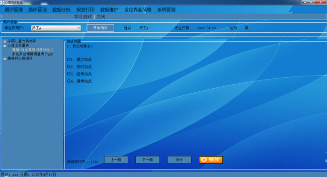 1.项目测试:项目测试也就是测试用户从电脑系统上答题,。测试人员利用此功能可以进行答题。统计答题结果及保存测试结果。在人员做过测试后,即刻自动生成心理测试报告。